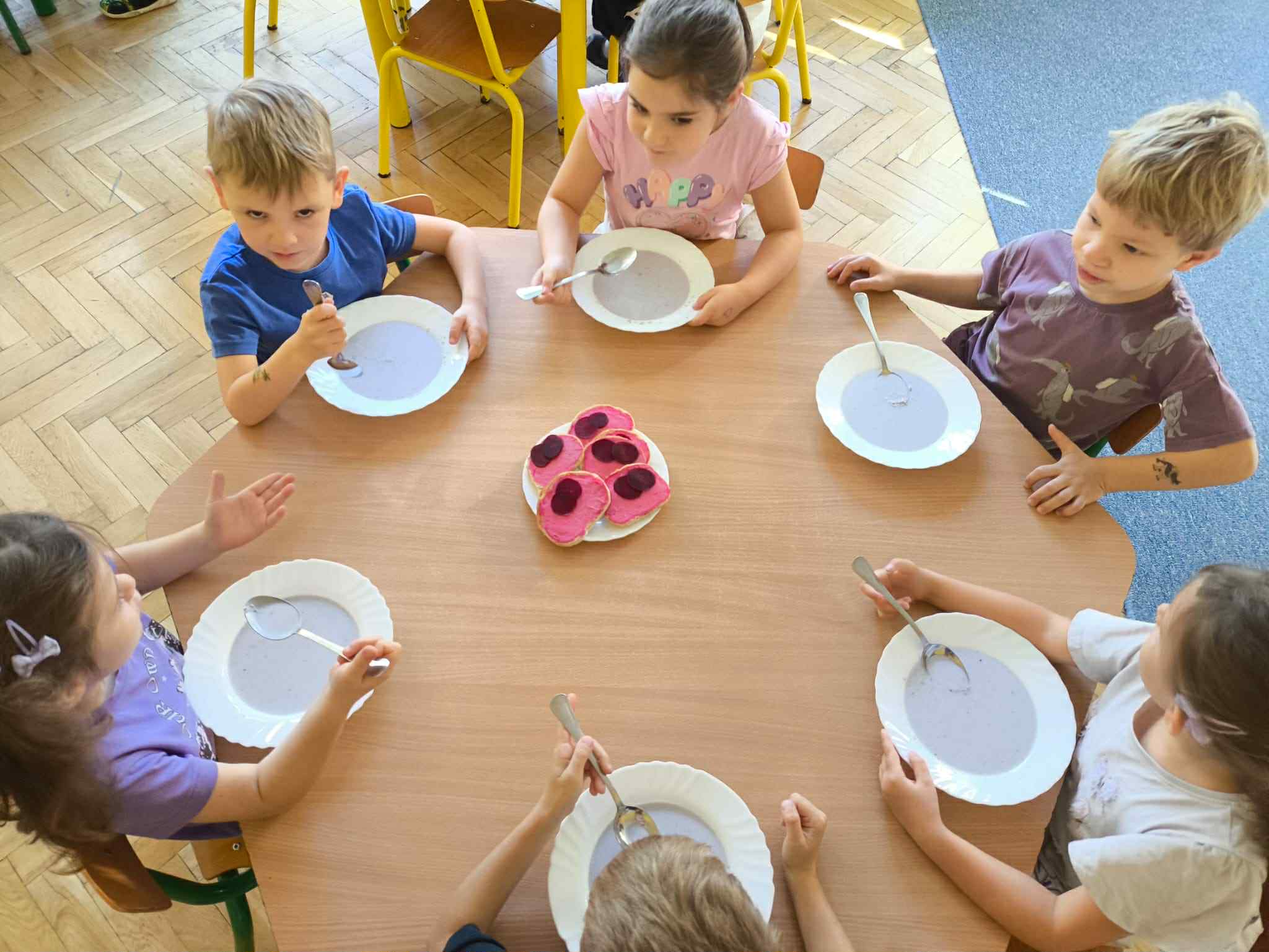 W piewrszy czwartek października w naszym przedszkolu królował kolor FIOLETOWY. Tym samym rozpoczęliśmy cykl KOLOROWE CZWARTKI. Jesień niesie bogactwo smaków i kolorów, co postanowiliśmy sprytnie wykorzystać. W ubiegły czwartek wszystko było fioletowe: fioletowe posiłki, fioletowe zabawy i fioletowe stroje. Bawilismy sie również z wykorzystaniem darów jesieni. Było kolorowo, smacznie, zdrowo i wesoło!
